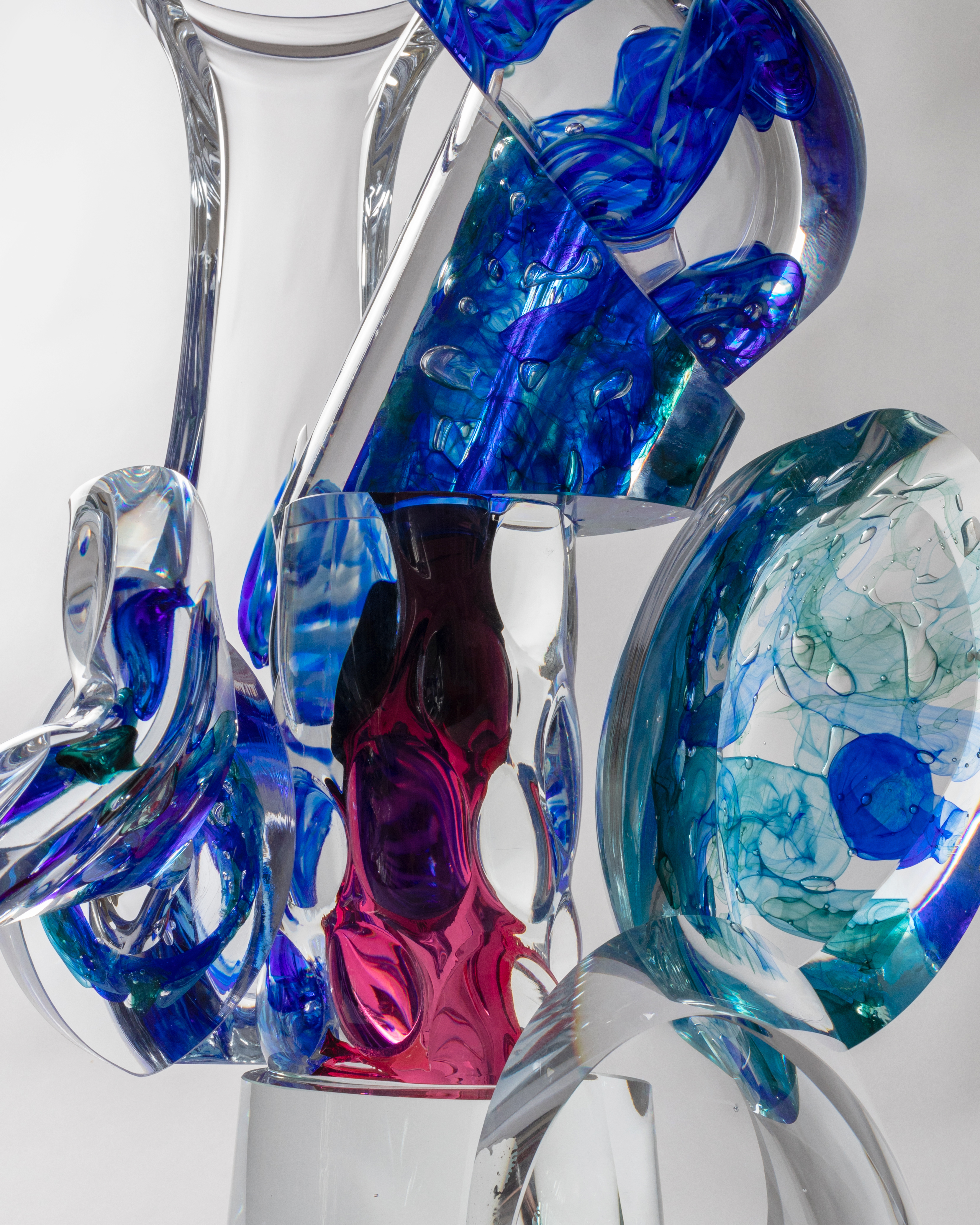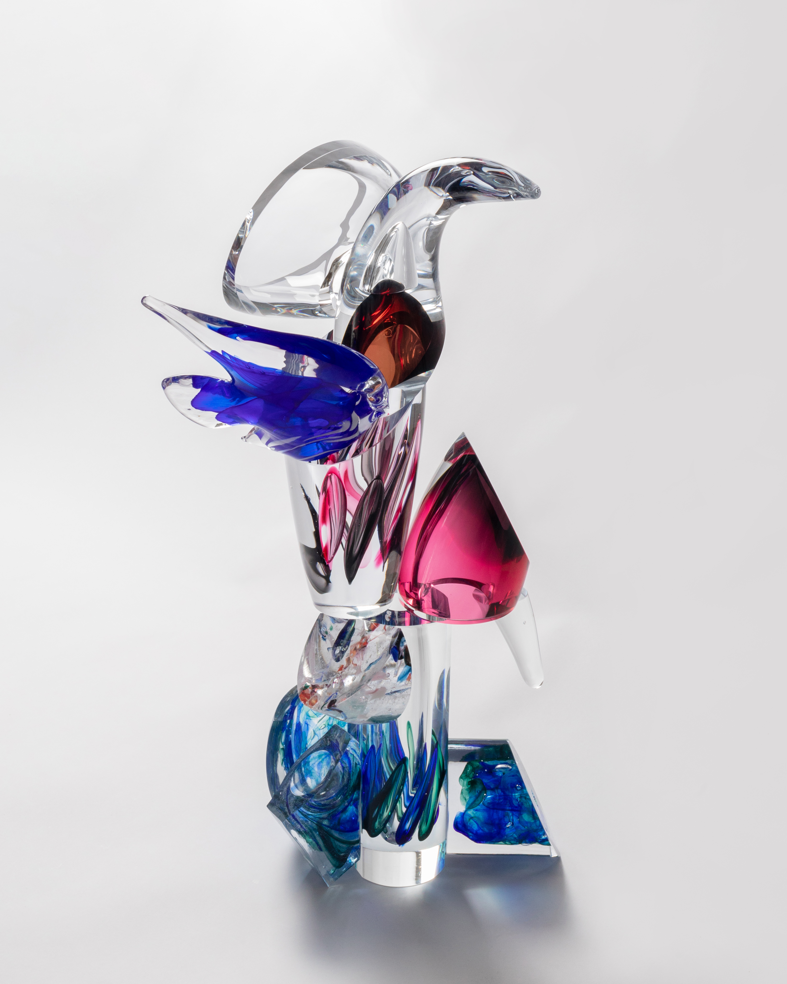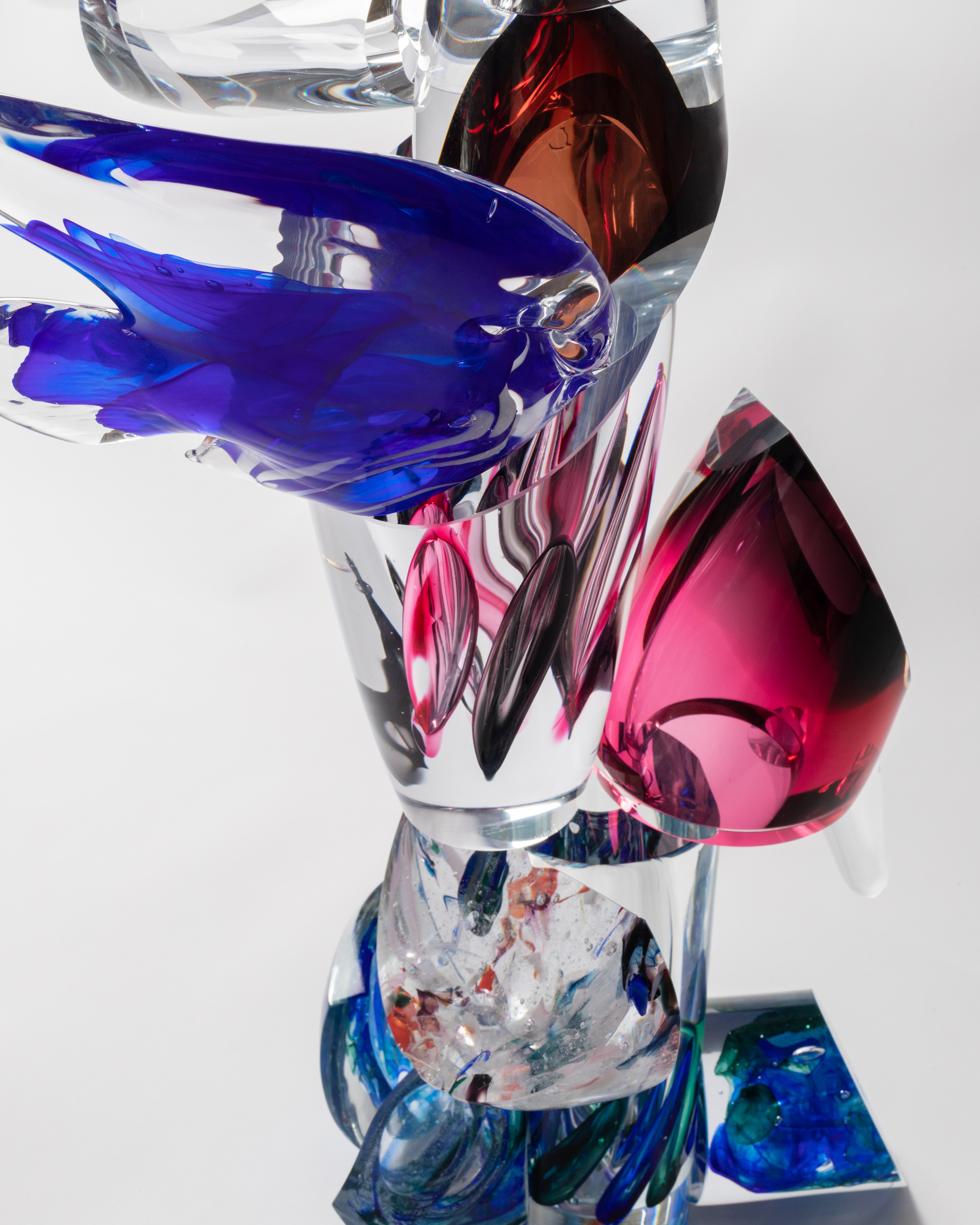 Each object in the series is composed of various glass components, visually rooted in the tradition of hot glasswork. These shapes reference the typical forms once produced in the artist’s father’s glass factory, echoing a regional aesthetic that has now almost entirely disappeared. The works are constructed from fragments of glass - cut, polished, and reassembled - preserving the traces of their origins while transforming them into something new.